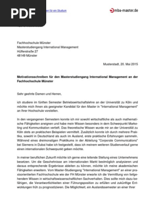 Motivationsschreiben studium master muster pdf. Download pdf unser muster motivationsschreiben fürs studium liefert dir eine hilfe für dein eigenes motivationsschreiben. Aufbau und muster für das master motivationsschreiben. Wir haben dir hier ein motivationsschreiben muster zusammengestellt wie du dein motivationsschreiben sowohl inhaltlich als auch zeittechnisch und formal gut vorbereiten kannst angelehnt an ucas 2018. Achte allerdings darauf dass sich ein motvationsschreiben für den master nicht nur bezüglich des inhalts sondern auch beim design von einem motivationsschreiben für eine bewerbung abhebt. Bei der bewerbung für den master wird neben den zeugnissen oft ein motivationsschreiben verlangt mit dem du die möglichkeit hast deine entscheidung für genau diese universität und genau dieses masterprogramm zu erklären. Das motivationsschreiben für den master sollten immer einen bezug zu deinem bachelorstudium herstellen und dein interesse an dieser fachrichtung betonen. Wer sich direkt nach dem bachelorstudiengang für ein masterprogramm entscheidet wählt sehr wahrscheinlich einen konsekutiven master circa 90 prozent aller masterstudiengänge zählen zu dieser kategorie.